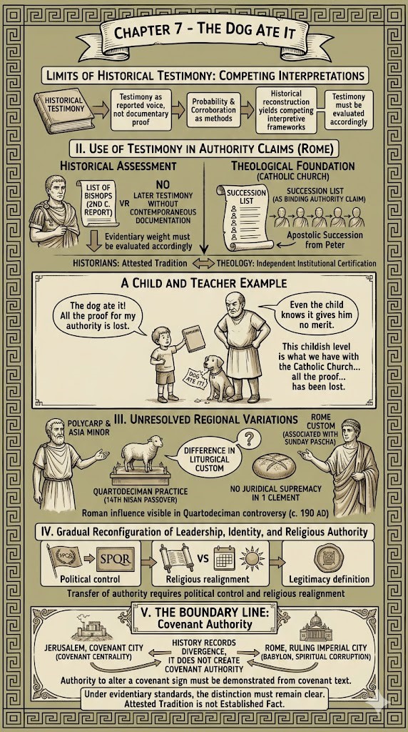 Therefore, if a church claims authority on the basis of succession, that claim rests on historical testimony outside the biblical text which is questionable at best. If a covenant sign was altered, the authorization for such change must be found within the apostolic teaching itself, not merely within later institutional lineage claims.